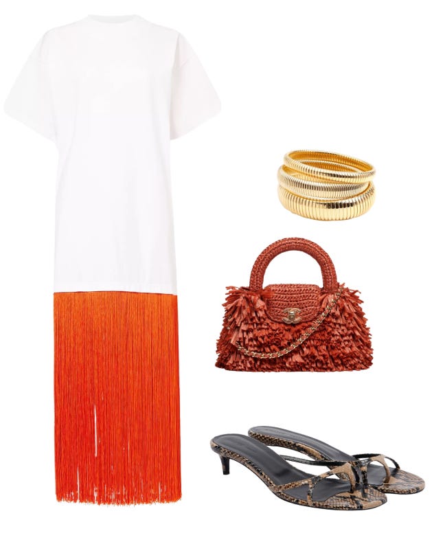 The Alaïa dress above is stunning but here are some much less expensive options. I actually love this skirt option that you can easily re-create the look with this oversized t-shirt. These Reformation sandals are a super similar option for much less. Also love this little orange bag that will add a pop of color to any summer outfit but for under $300. These bangles I’ve had for about 3 years now and they still make them, such a perfect pop to any outfit and they don’t break the bank.